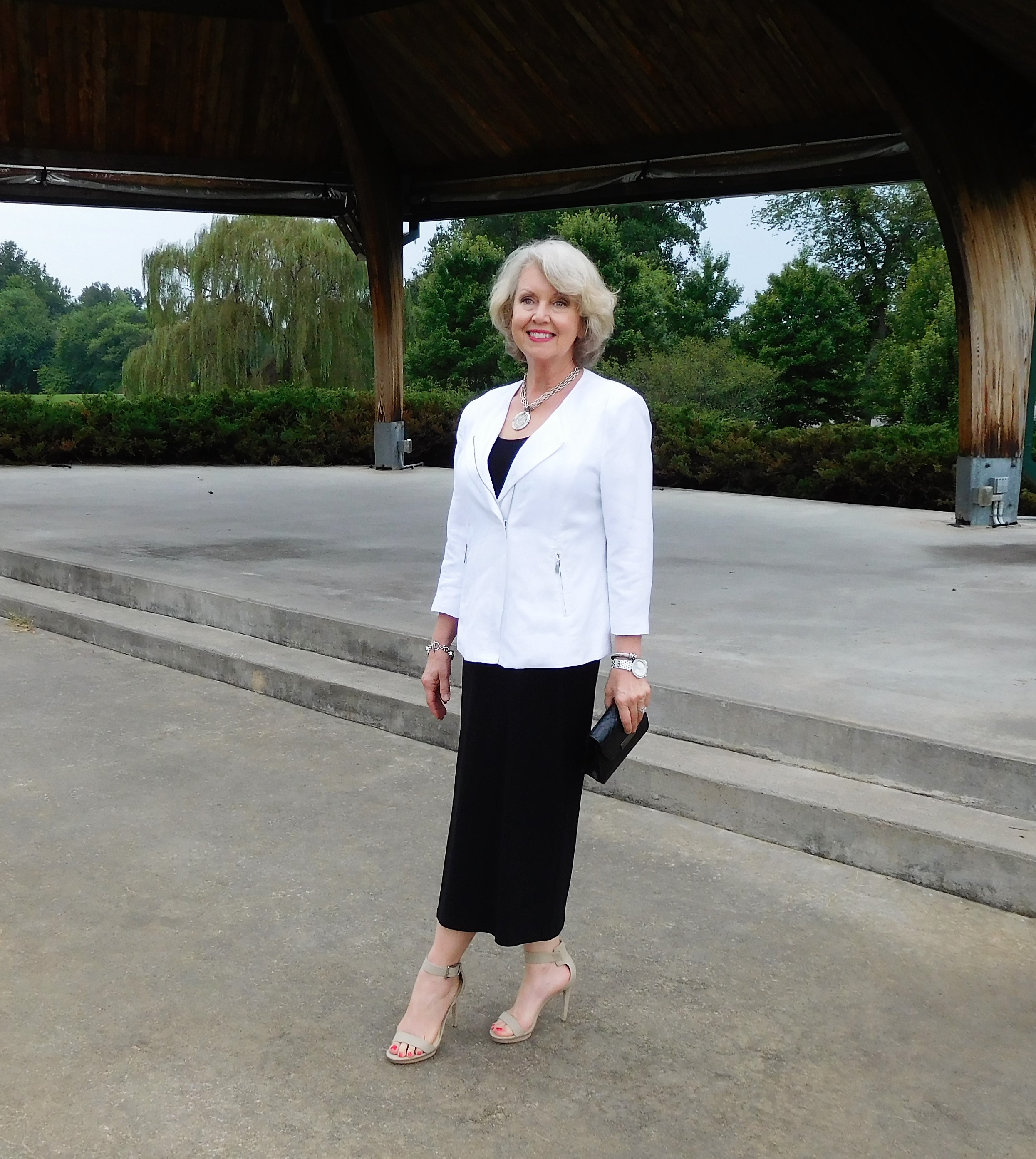 Here is Susan in a basic, black tank dress and white blazer. She says: